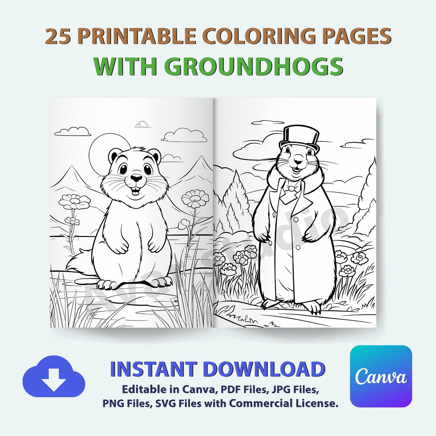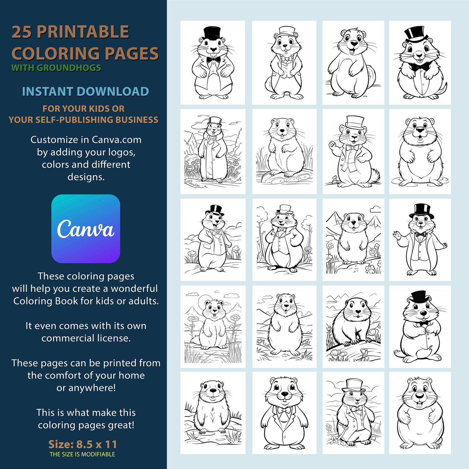 Groundhog Coloring Sheets | KDP 25 Fun Coloring Pages Printable at Home or SELF-PUBLISHING with Commercial License - Canva Editable